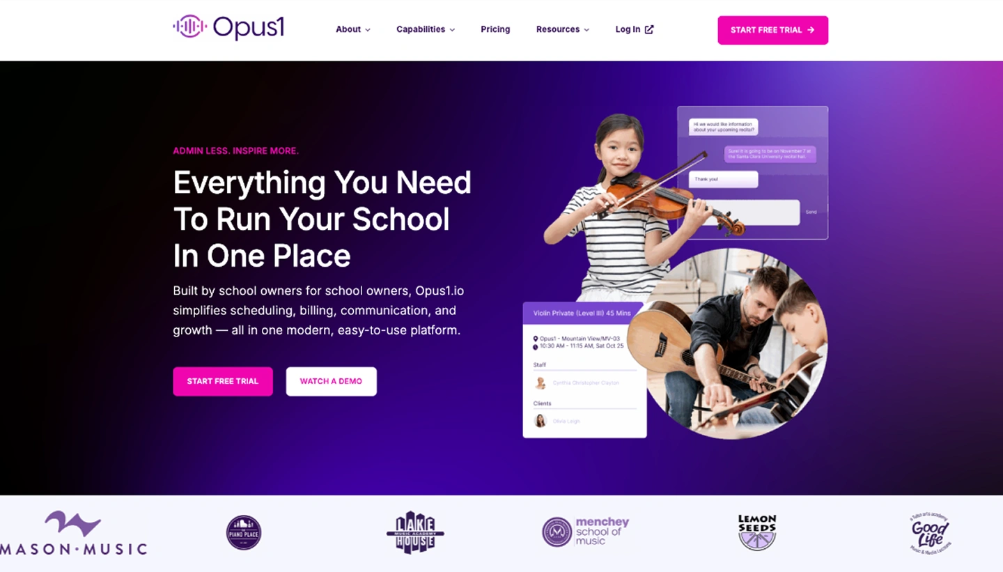 Opus1 provides all-in-one management software for music and performing arts schools, helping studio owners run every part of their business—from scheduling and billing to customer communication and teacher management—in a single platform. Built by a school owner for school owners, Opus1 stands apart by combining deep industry insight with intuitive tools that simplify operations without sacrificing control. The platform is growing quickly, with more than 40% year-over-year growth as word spreads across the music education community.